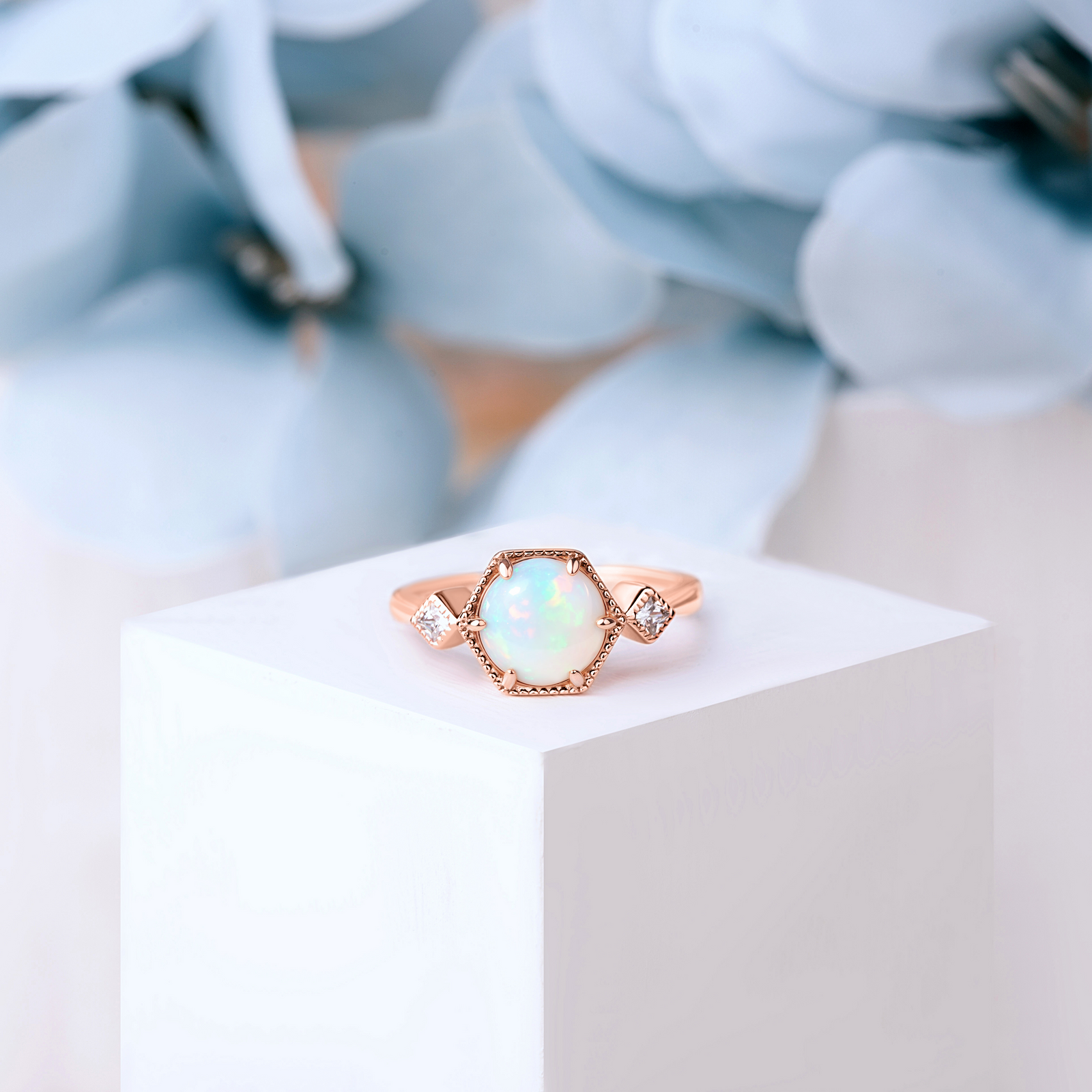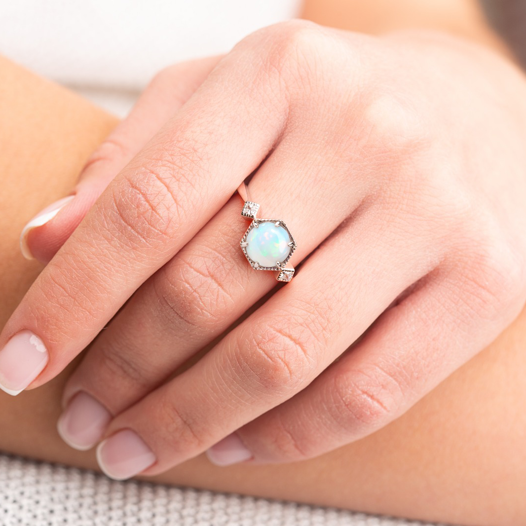 Captivating Opal Centerstone: The 8 x 8 mm oval Opal at the heart of this ring is celebrated for its dynamic play of colors, symbolizing love, creativity, and emotional balance. Each opal is unique, ensuring that your ring is as special as the love it represents.