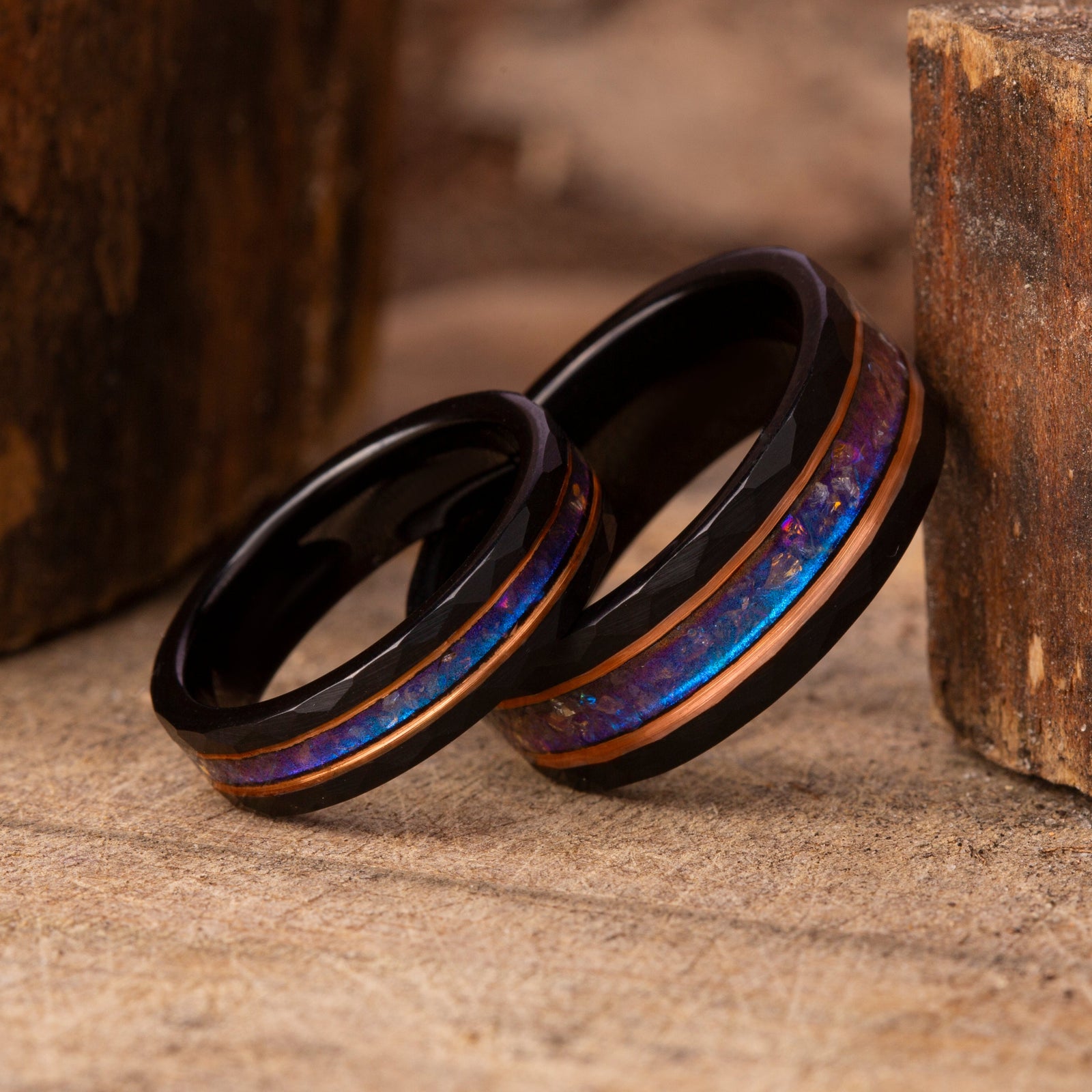 LUMINA DUET is a cosmic-inspired couple’s set featuring genuine crushed Alexandrite inlay that shifts between twilight greens, deep violets, and ocean blues. Crafted in 8mm and 4mm widths, these rings symbolize balance, unity, and individuality, with a soft, galaxy-like shimmer unique to each set.